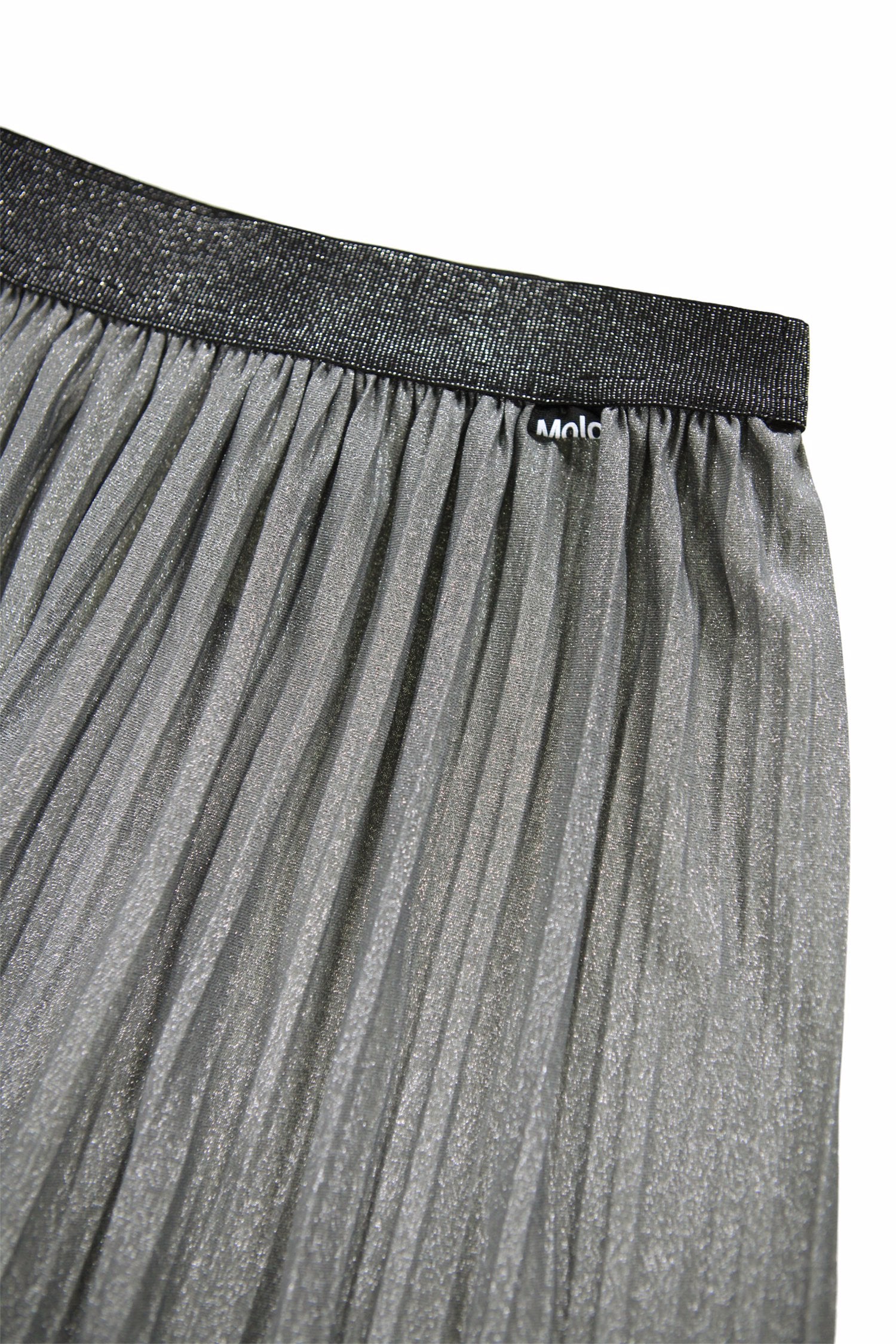 Pleated skirt in grey glitter. The skirt has elastic in the waist, so it can be worn high on the waist or on the hip. The skirt has a length to mid-shin and falls beautifully.
