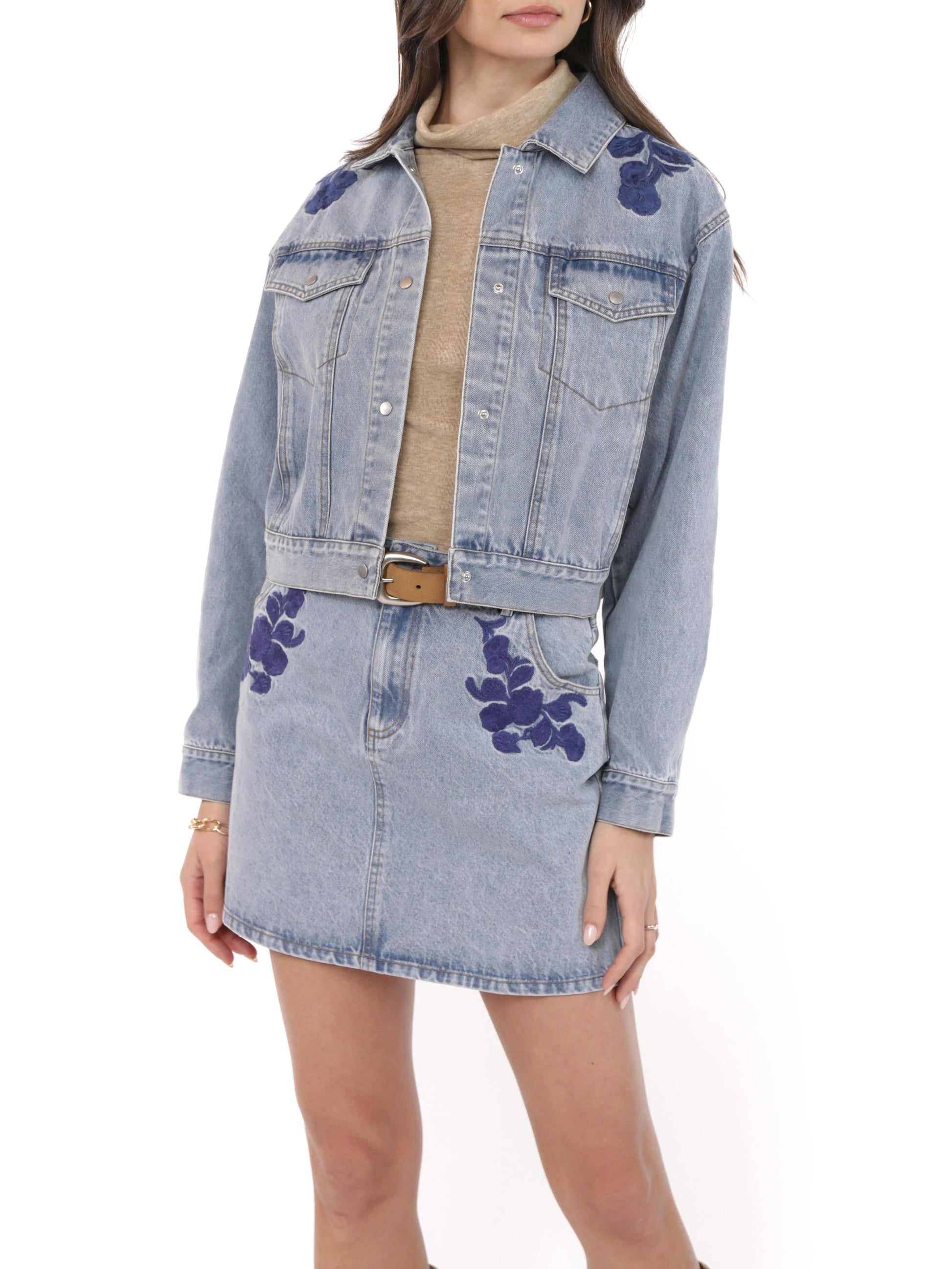 Light/ medium wash denim jacket with navy embroidered flowers on shoulders. Slightly cropped fit, snap front enclosure, cinched elastic band in back. Front pockets with snap enclosure.