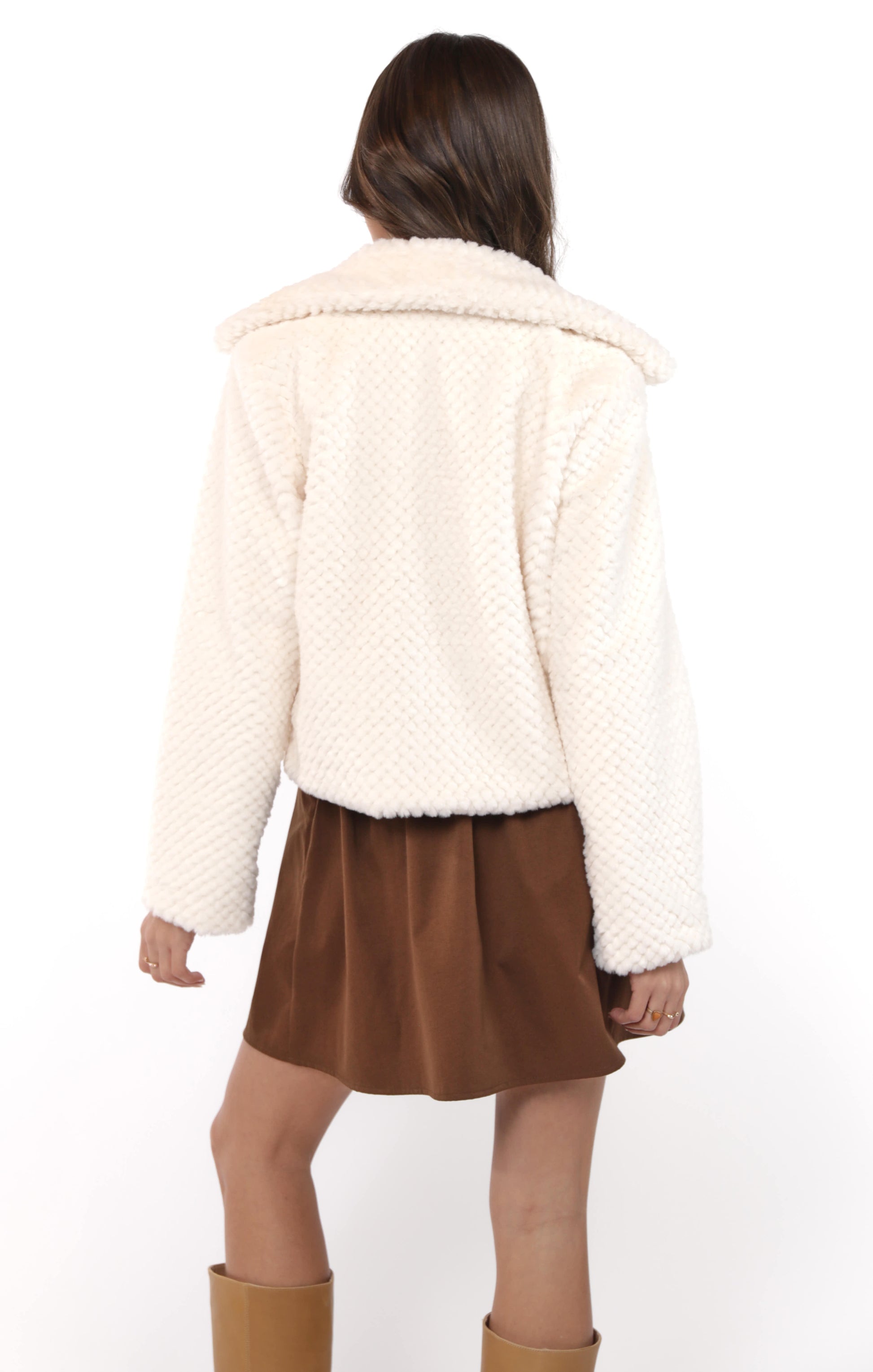 Ivory faux fur coat with wide lapel, 2 latch closure, and functioning pockets! Soft satin feel lining.