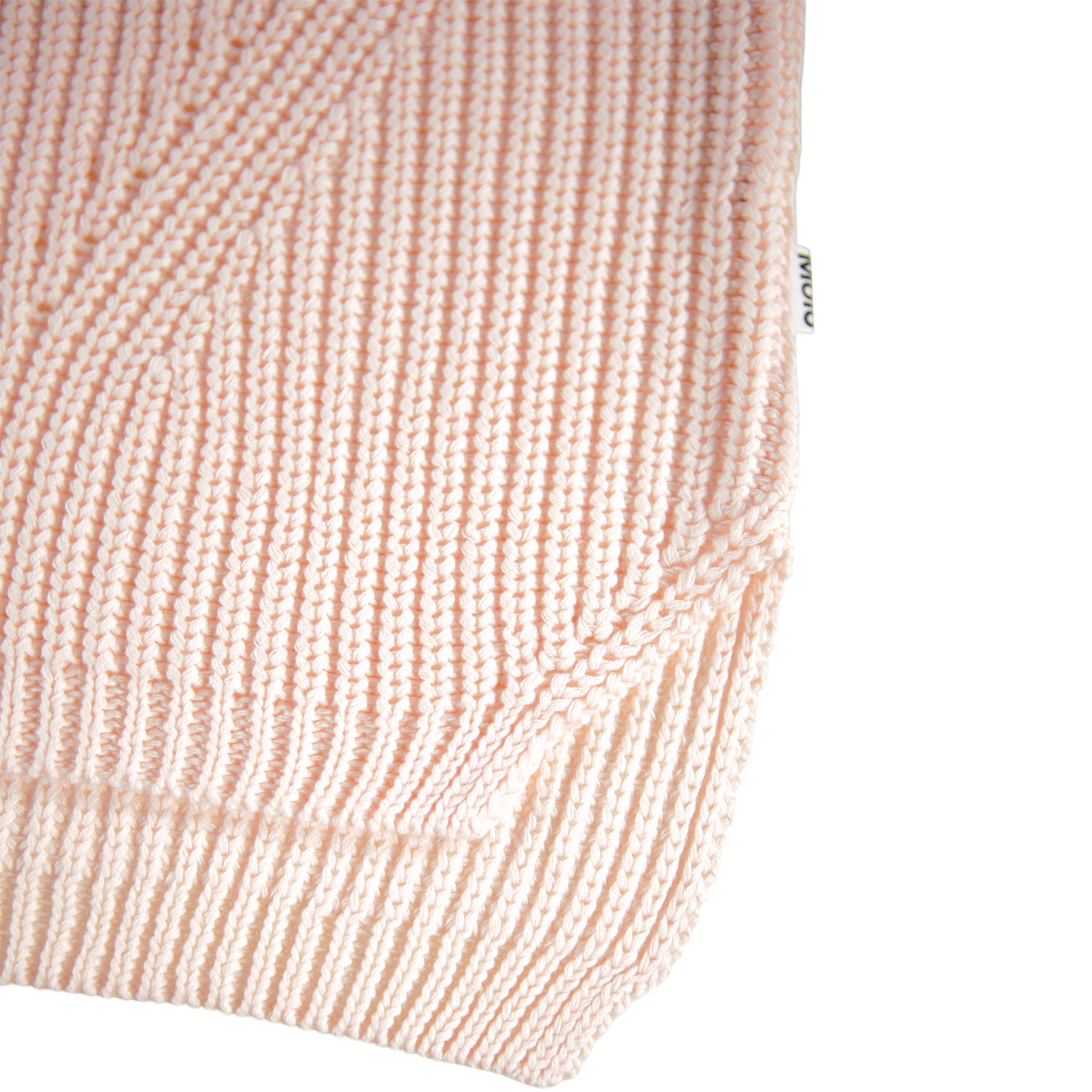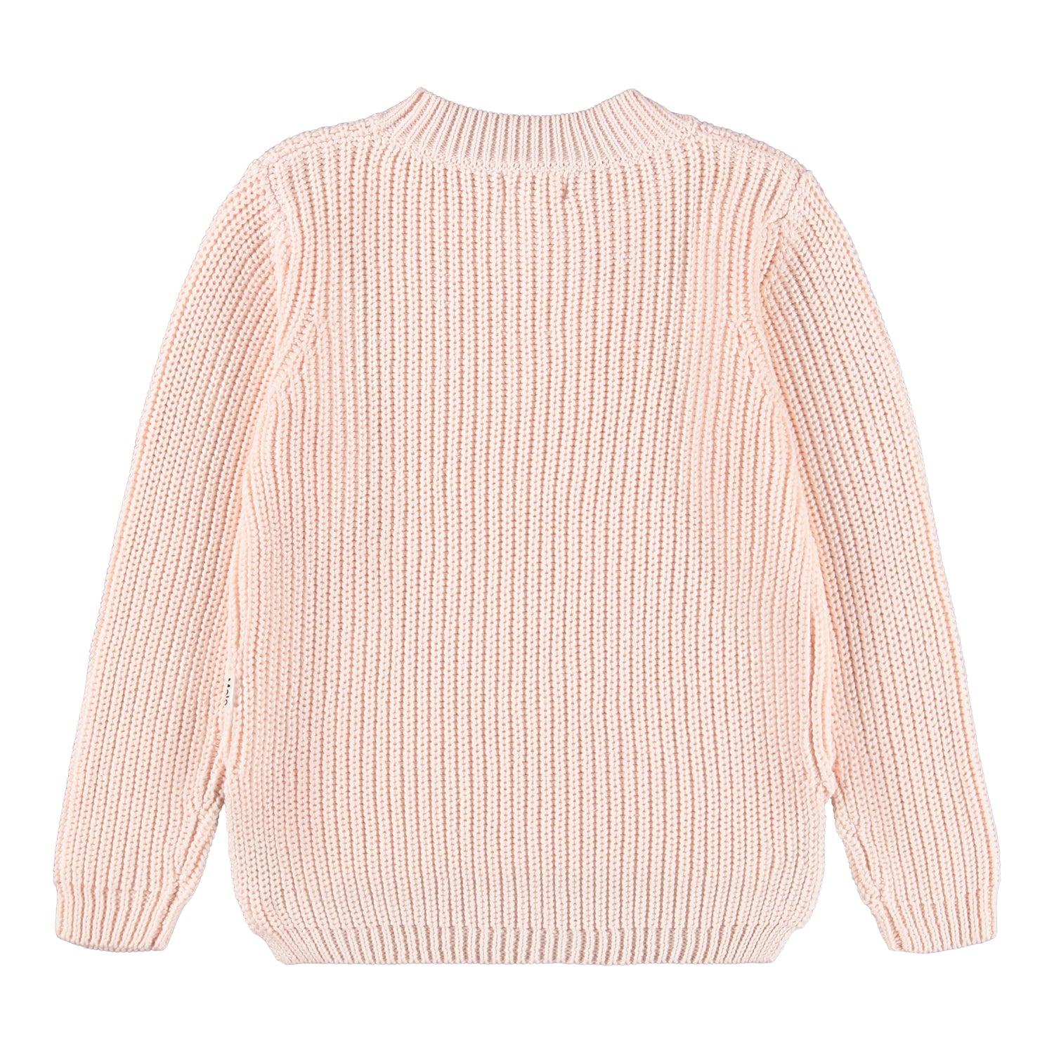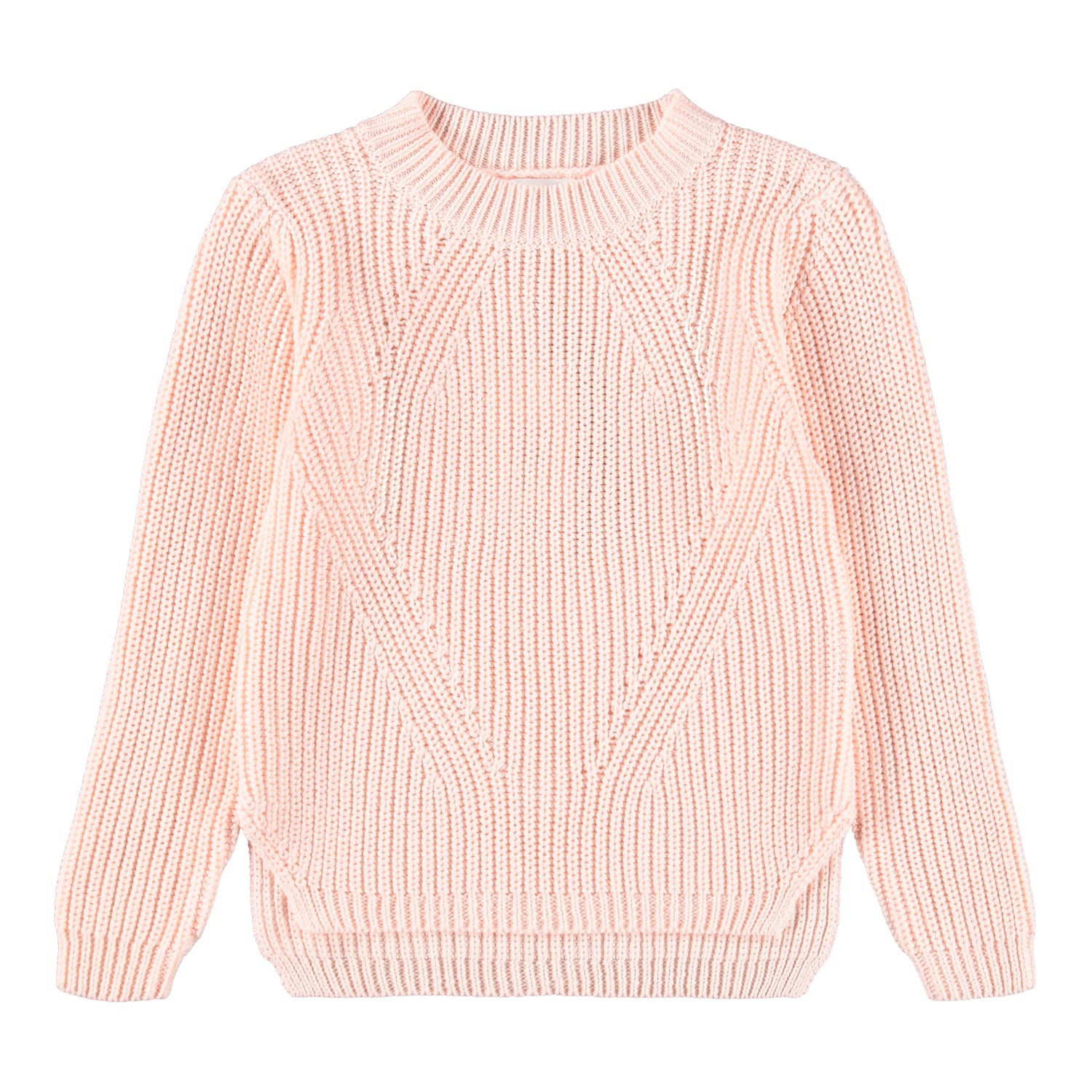 Rose long-sleeved knitted sweater made of soft organic cotton with a round neck. The sweater has a loose fit, is ribbed with a fine patern, has extra length at the back, and slits on the sides.