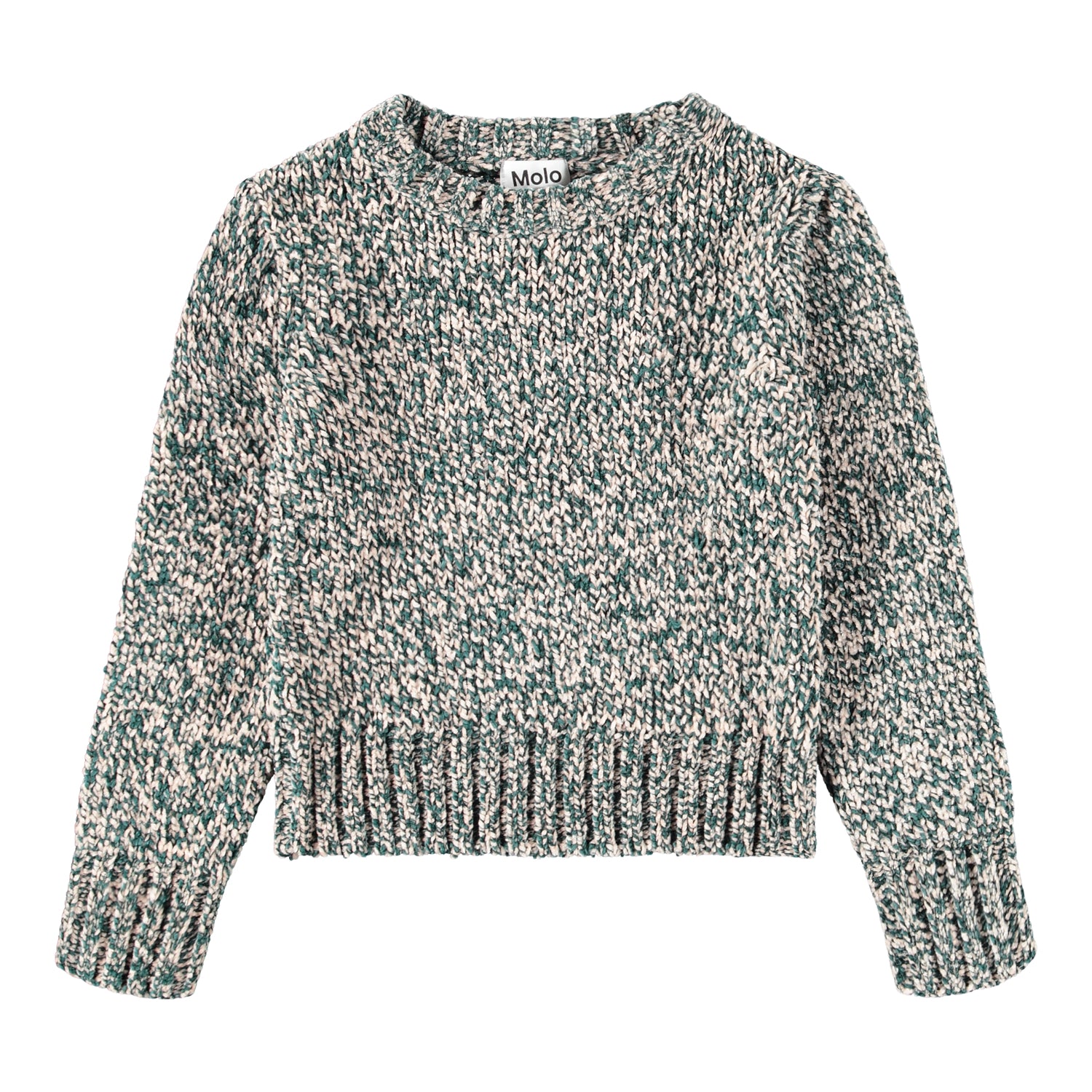 Knitted sweater made of a chenille yarn. The sweater is knitted in a beautiful green and pink melange, with ribbed edges around the neck, sleeves and waist.