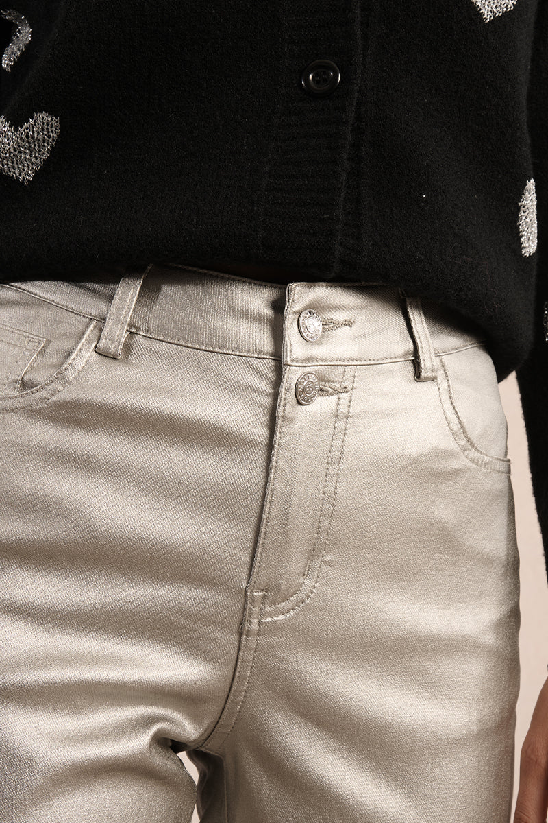 High waisted wide leg silver coated metallic trousers with front and back pockets.