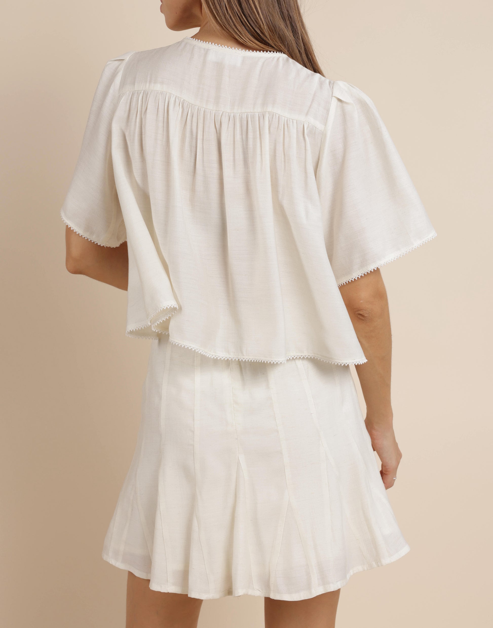 Flowy cream button up blouse with short sleeves and pin tuck details. Loose, lightweight fit. Lacey trim details at neckline, sleeves, and hem.