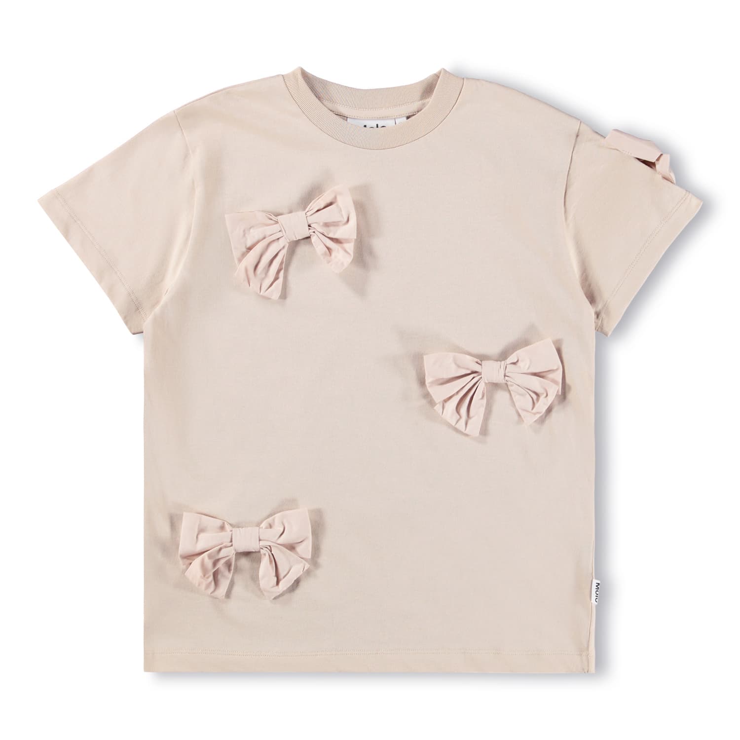 Soft blush colored T shirt with 3D bow details.
