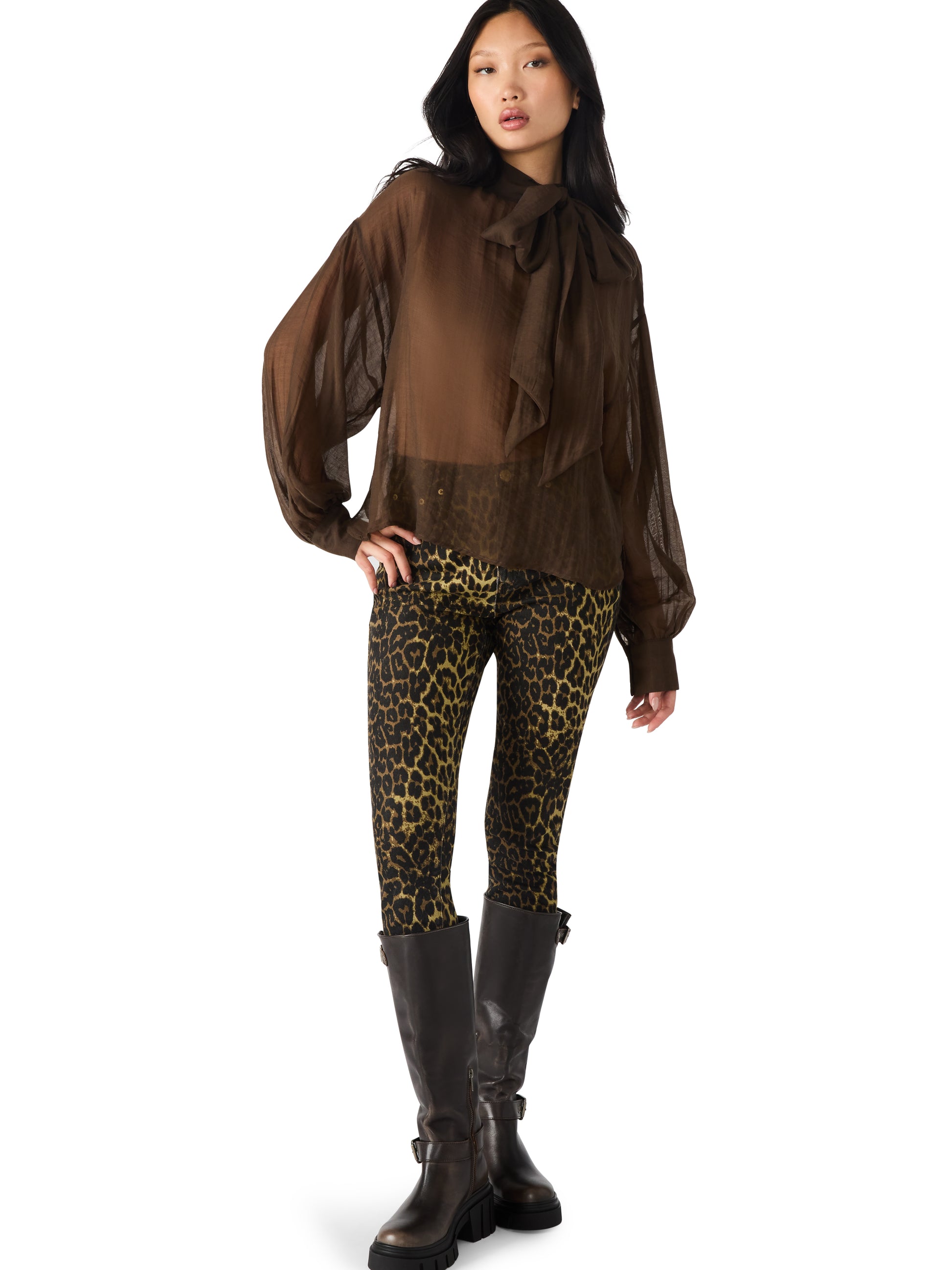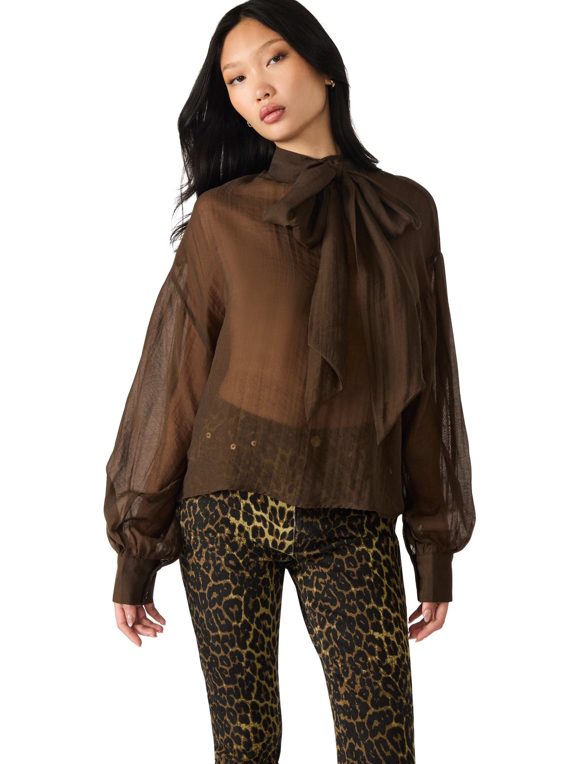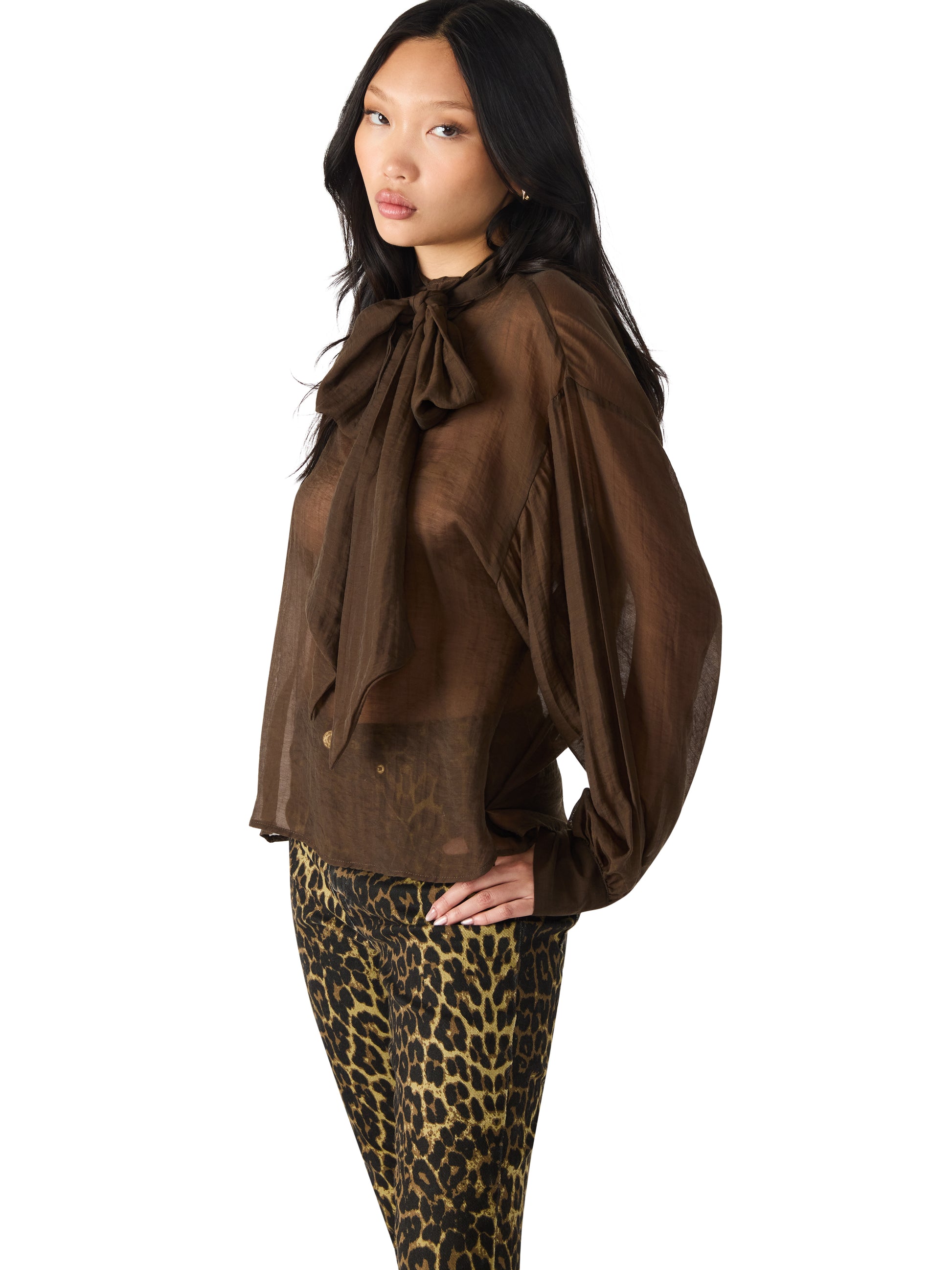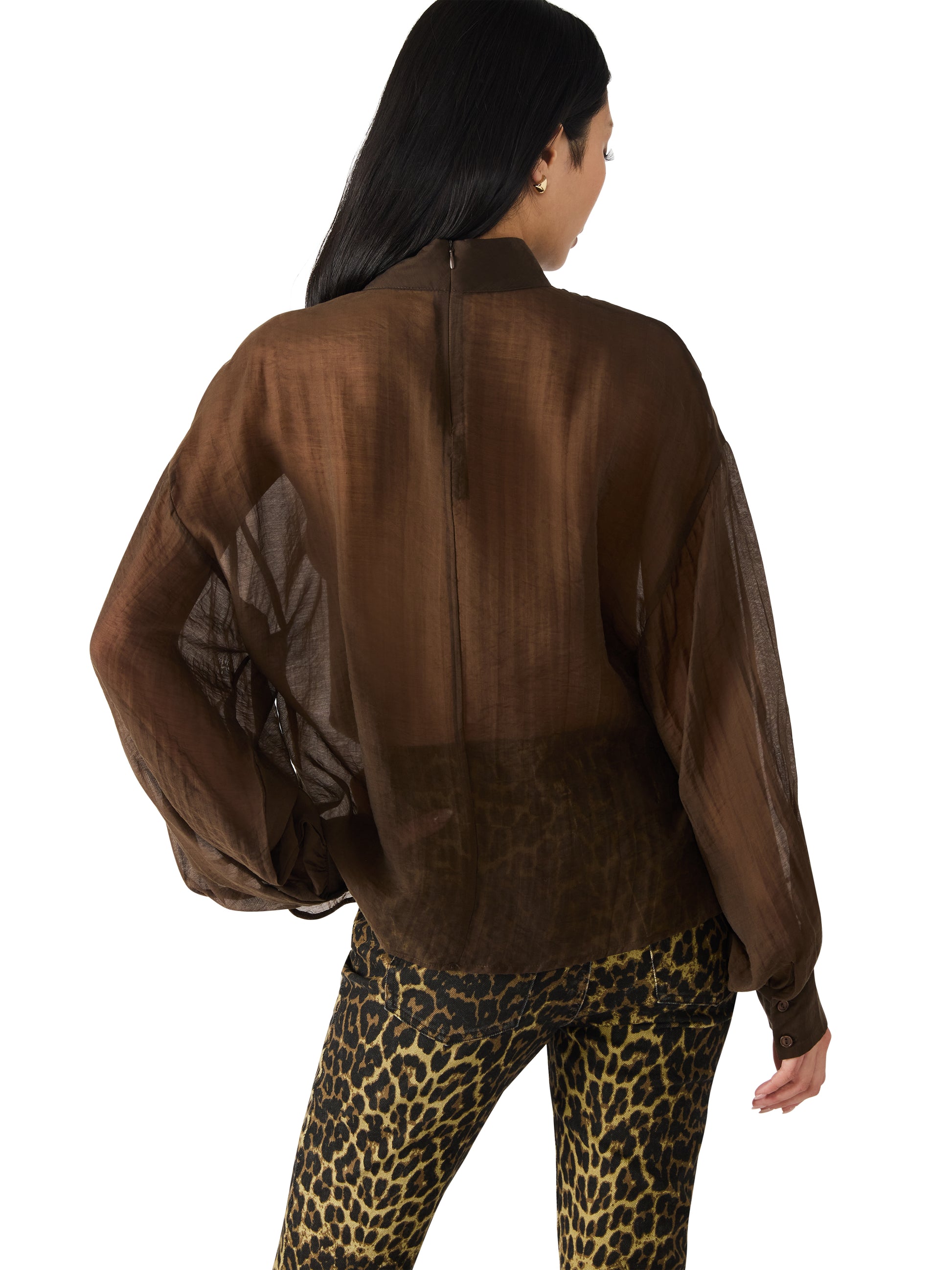 Chocolate brown sheer blouse with long balloon sleeves, fitted wrist cuffs with buttons, and mock neck with scarf tie detail.