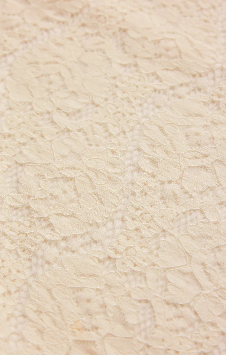 Ivory stretch floral lace midi skirt with elastic waistband. High rise fit with scalloped hem. Pair with our Aurora Lace top to complete the look!